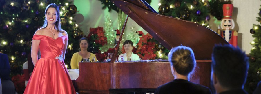 Stock footage of NYC, I love you. We’re at some kind of theater, where Margot is on the phone with her sister. Margot is a pianist, with sold-out Christmas concerts. Margot has just been reviewed badly by the Evelyn March, who said she was technically gifted but did not play with heart. Margot is playing on a stage with far too many Christmas trees, and it looks like the theater she’s in is cursed, as it’s falling apart.