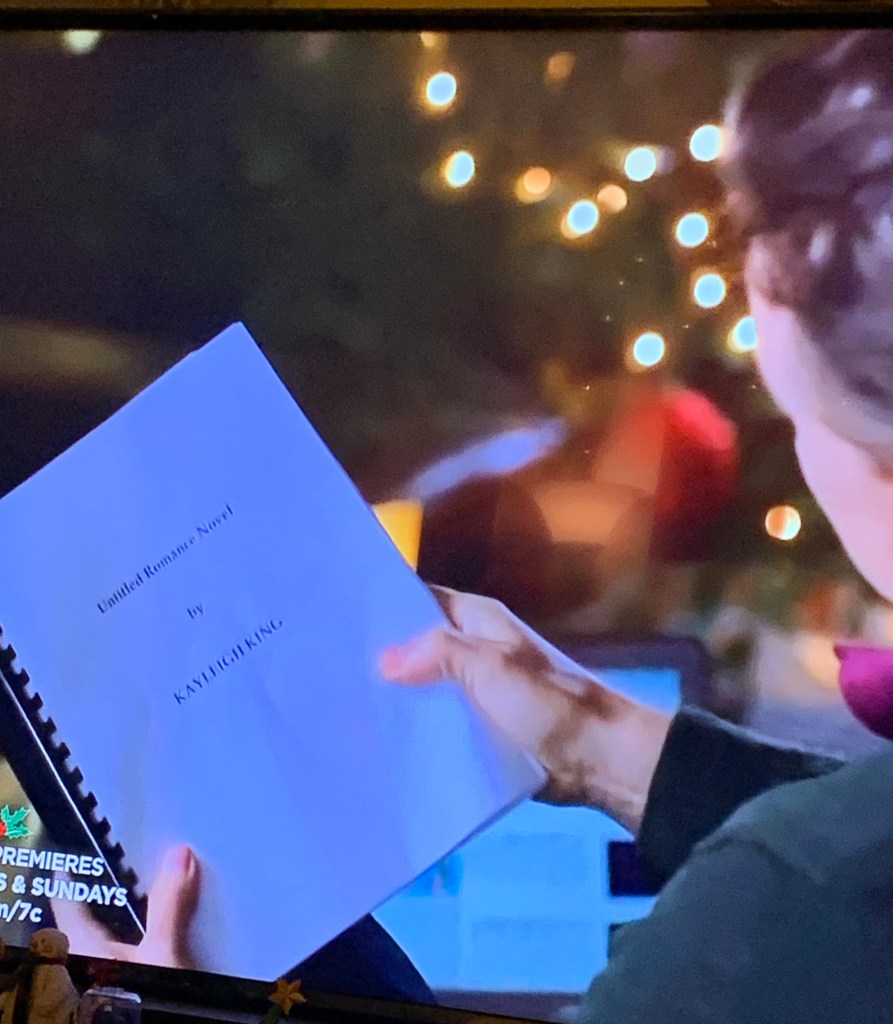 She’s headed home to Pineberry for Christmas and calls her sister. Sister owns a bakery, and there’s a niece named Charlotte who also wants to be a writer. Cut back to the paper, where Trip Wyndham is about to get chewed out because everyone loved Kaylee’s column and Trip didn’t do any research and royally f’d up his job on his second day. Guess Trip Wyndham is about to go eat some crow, but before he can apologize, Kaylee hangs up on him. Kaylee and sister have a heart-to-heart about the fact that sister is a widow and doesn’t get out much, but there’s a mysterious man named Rob Hartman who you know will show up soon.
