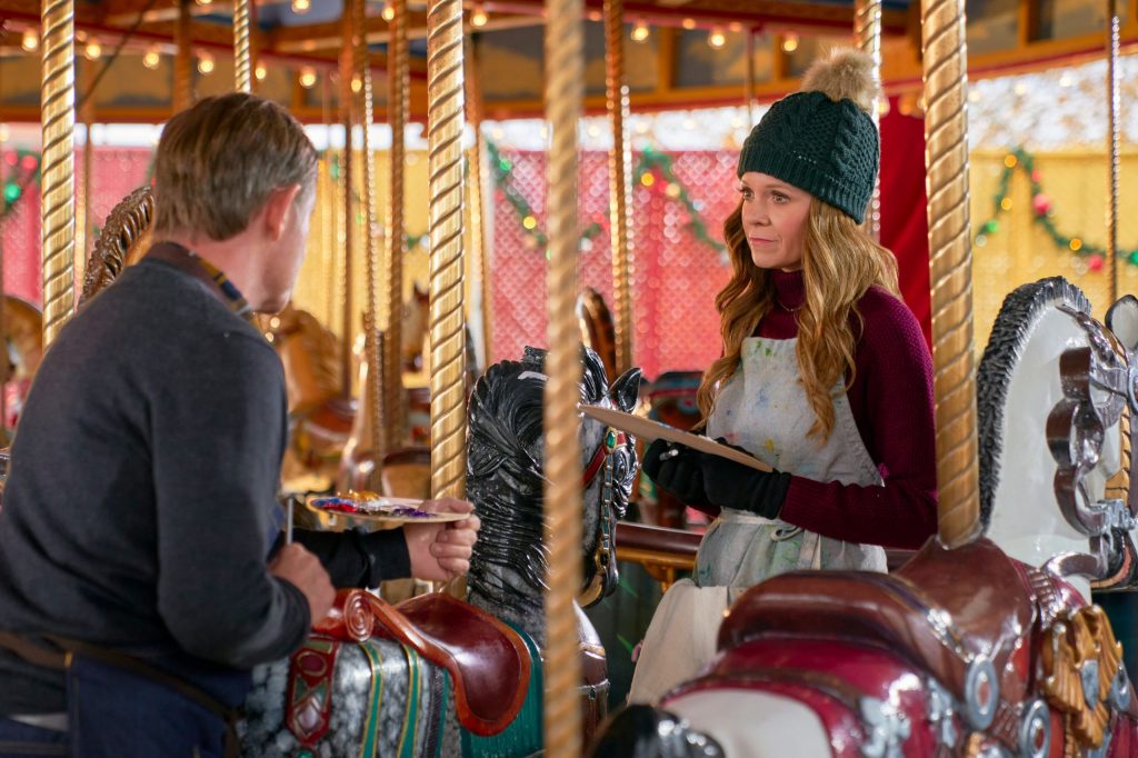 We start in a town on a seashore with a big church. It’s VERY snowy there, but it doesn’t stop kids from coloring in the outside. Heroine is Miss Thomas, some kind of teacher, whose favorite Christmas memory centers around a carousel that she is showing these precocious children. She’s a grown woman wearing a hat with a big old pom-pom on the top, and I’m sorry, but I’ve never been fan of that look, like, ever. Miss Thomas’s great-grandfather built the carousel and all the kids get a ride. She also is a restorer of carousels. There’s also a “Wishing Horse” on the carousel. And now, her dream job opening up in the school district…will she apply?